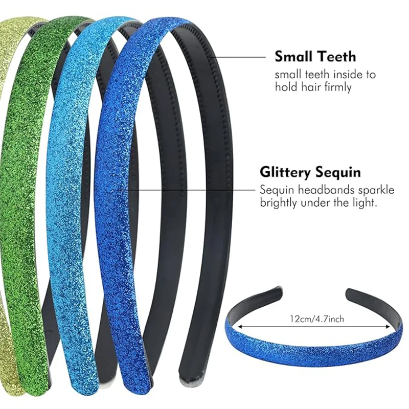 Useita käyttöskenaarioita: Glitter juhlat pukeutuvat muoviset otsanauhat sopivat erilaisiin tilaisuuksiin, arkivaatteista häihin, PROMeihin, juhliin jne. Ne ovat koristeellisia hiuspanoksia, jotka voivat lisätä ripaus kirkkautta mihin tahansa tyyliin ja sopivat naisille, tytöille, teini-ikäisille ja lapsille.