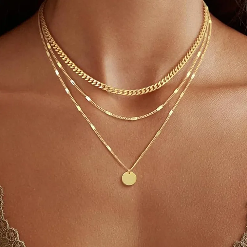 YD JEWELillä on oma tehdas, ja se on naisten kullattujen naisten muotikaulakorujen valmistaja ja toimittaja Kiinassa. Tässä mallissa on kolme kerrosta ketjuja eri tyyleillä, 14K kullattu ja messinkipohjainen materiaali. Kaikki on varustettu 5 cm säädettävällä jatkoketjulla, joka mahdollistaa yhden käytön tai kerrostuksen, joten se sopii useisiin tilanteisiin.