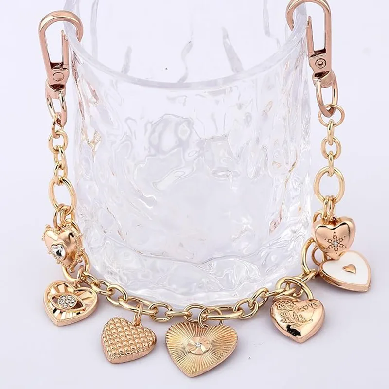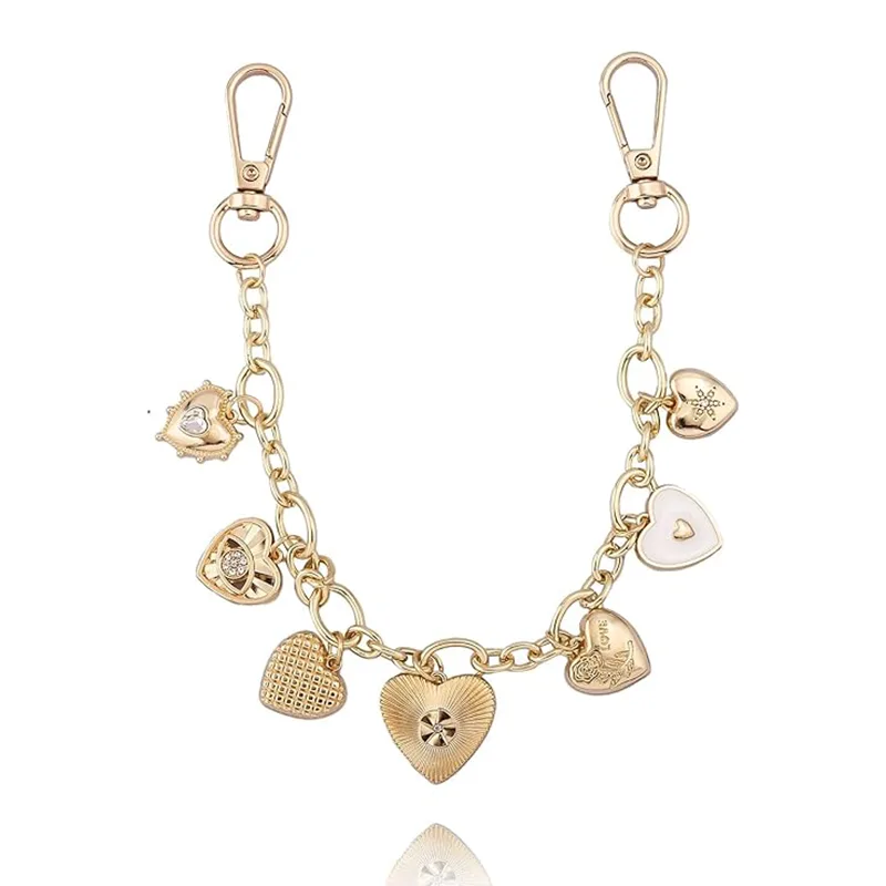 Sinkkiseoskäsilaukku Charm on innovatiivinen muotoilu. Jokaisella 7 sydämenmuotoisella riipuksella on nerokas muotoilu ja ne on yhdistetty metalliketjuihin. Yleinen tyyli on muodikas ja söpö. Olipa kyseessä katseenvangitsija kulta tai hieno hopea, niillä kaikilla on ominaisuus herättää huomiota itsestään. Sen ripustaminen laukkuun voi hetkessä parantaa asusteiden tyyliä tehden tavallisista pienistä laukkuista ja käsilaukuista design-suuntautuneempia ja helpottaa erottumista ulkona.
